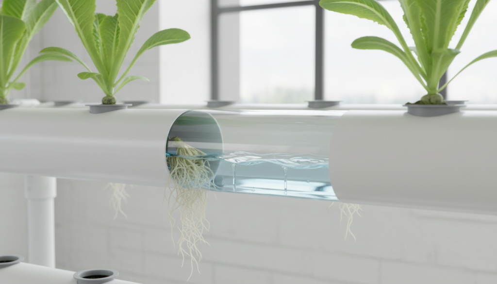 एनएफटी (NFT) दुनिया भर में सबसे ज्यादा लोकप्रिय प्रणाली है। इसमें पौधों को पीवीसी (PVC) पाइपों में बने छेदों में नेट पॉट्स के सहारे रखा जाता है। पाइप के अंदर पोषक तत्वों से भरा पानी एक पतली फिल्म (परत) के रूप में लगातार बहता रहता है। जड़ें इस बहते पानी से न्यूट्रिएंट्स लेती हैं। यह पत्तेदार सब्जियों जैसे लेट्यूस और पालक के लिए सबसे अच्छा है।