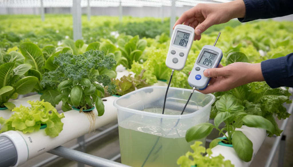 टीडीएस (TDS) और पीएच (pH) मीटर से पोषक तत्वों के घोल की जांच करना अत्यंत महत्वपूर्ण है।