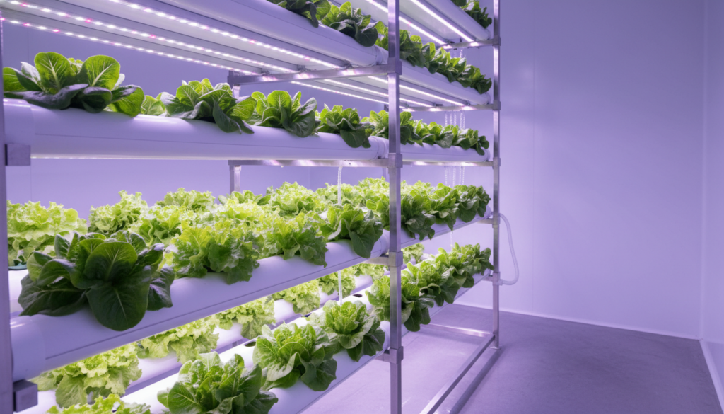 एक आधुनिक इनडोर हाइड्रोपोनिक्स सेटअप जिसमें पत्तेदार सब्जियां उगाई जा रही हैं।
